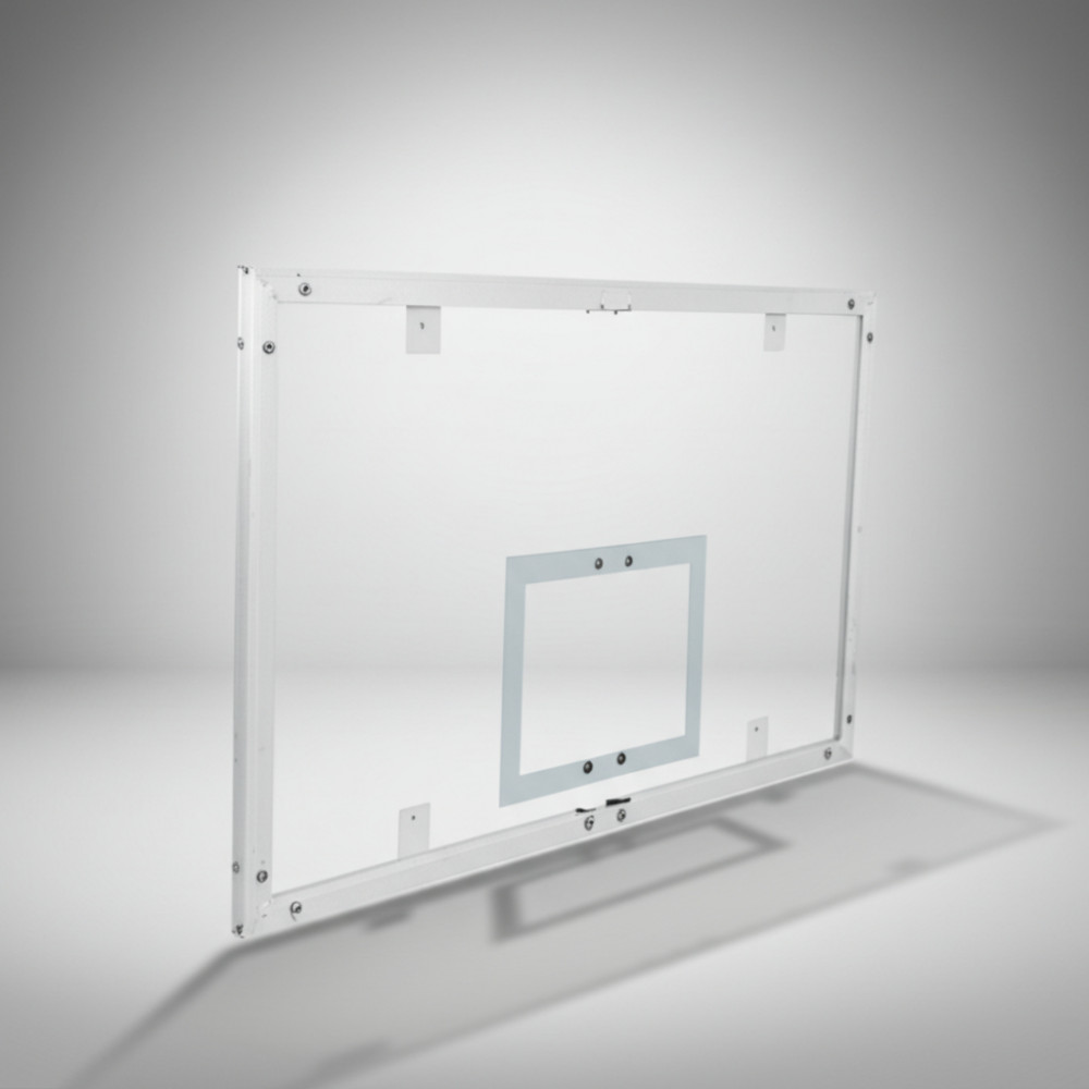 В производстве данного щита используется цельное противоударное акриловое оргстекло повышенной толщины 15 мм, рама изготовлена из металлического профиля 40х40мм и имеет монтажные отверстия и "клыки" для крепления к ферме или стойке а также отверстия для крепления баскетбольного кольца. Место под баскетбольное кольцо идет размерами 100Х110 мм. Размер щита 1800 x 1050 мм, что соответствует требованиям FIBA.